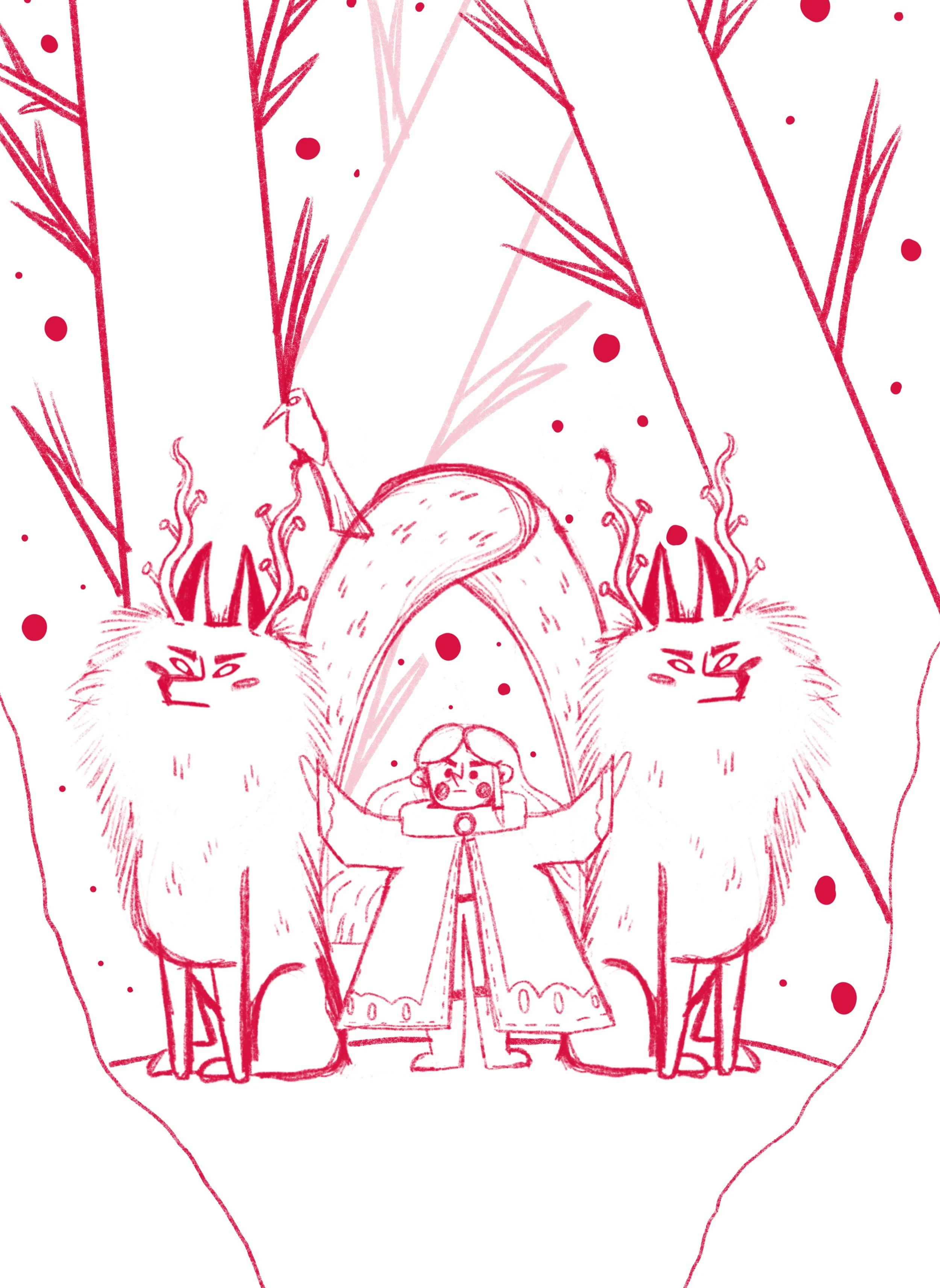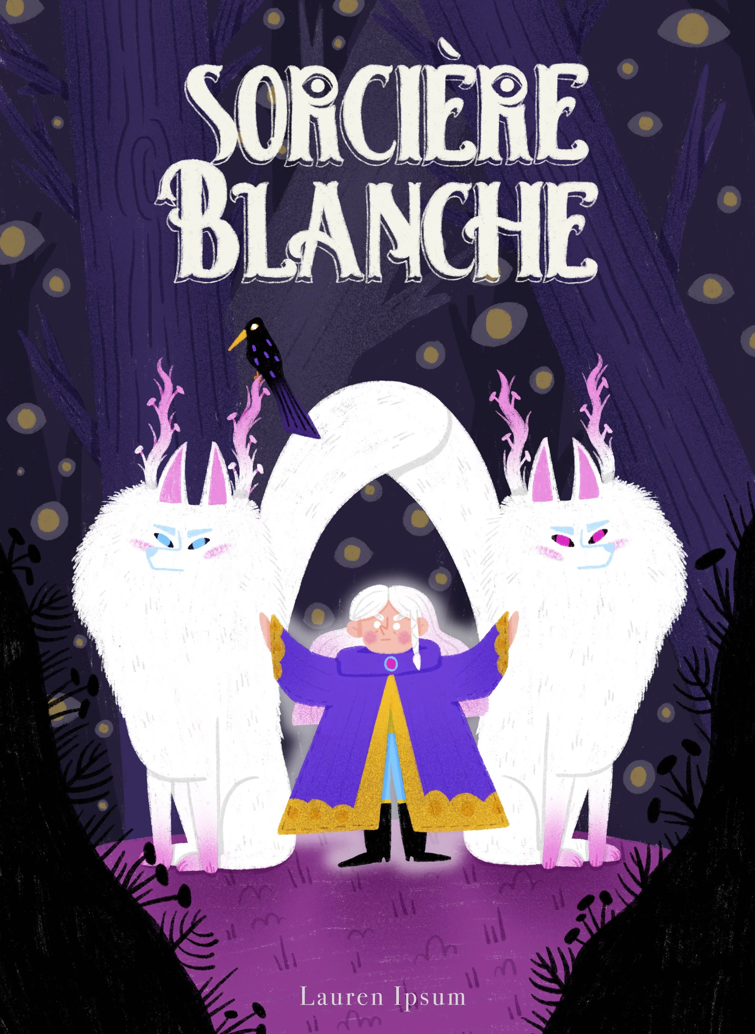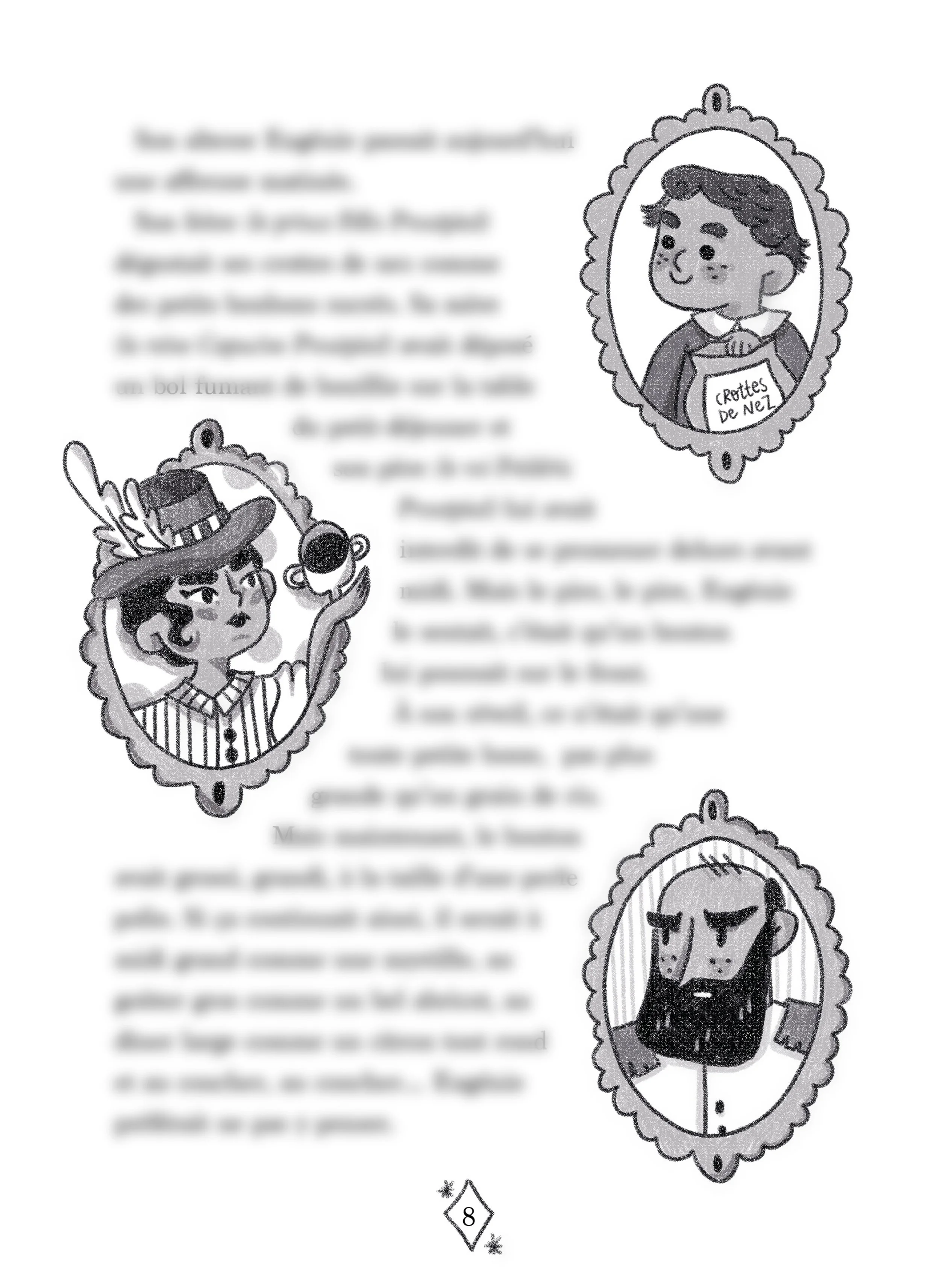 “Son Altesse Eugénie Proutpied et la Corne de Licorne” est un véritable texte écrit par mon amie Pauline. Inspirée par le texte, j'ai créé au projet une couverture fictive et quelques illustrations intérieures.